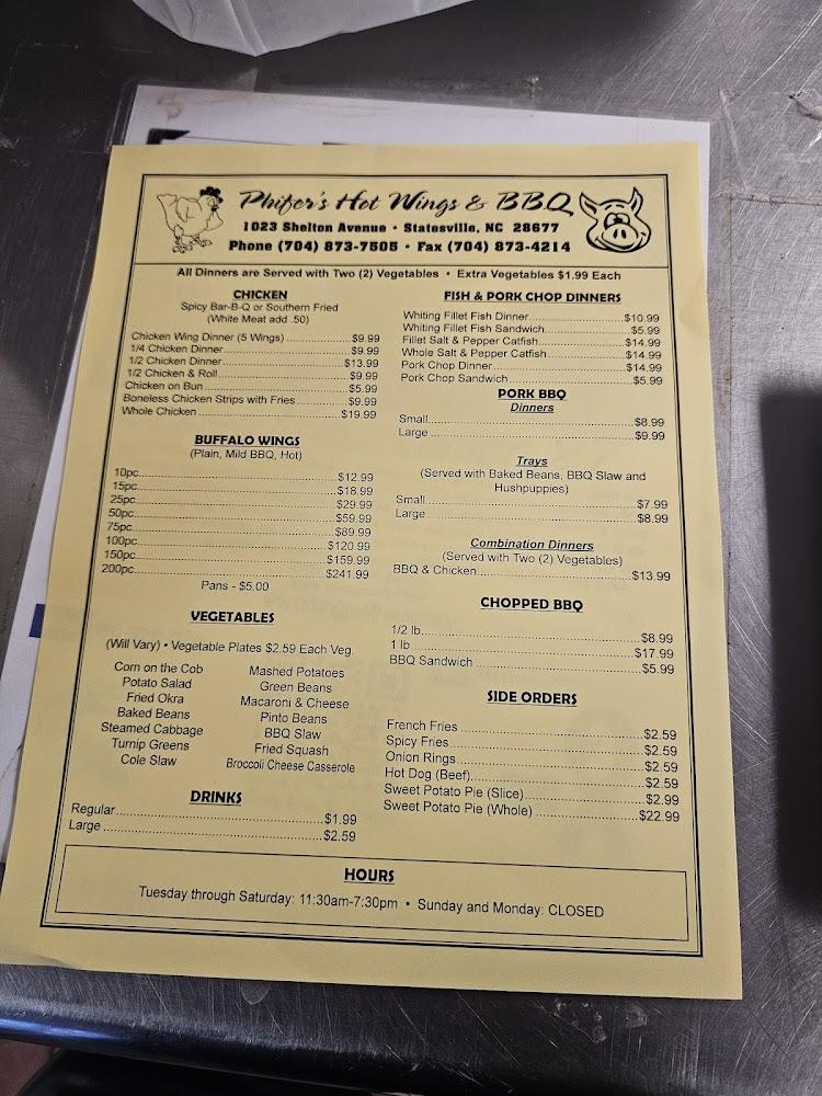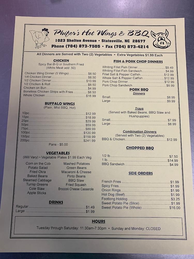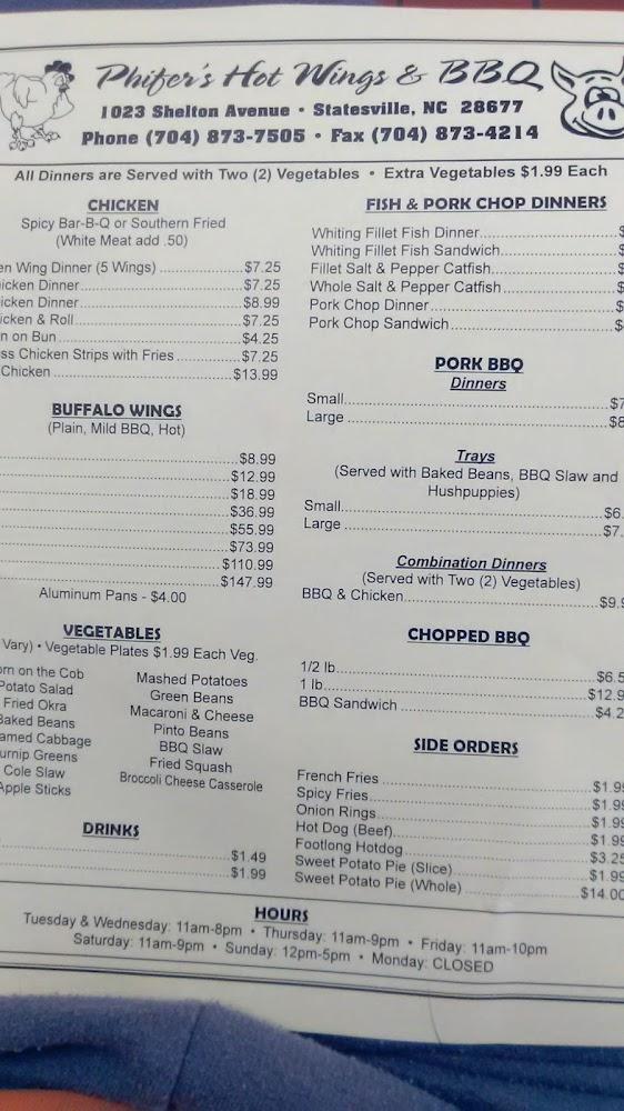 Welcome to Phifer's Hot Wings & Bar-B-Q, your go-to destination for mouthwatering grilled specialties in Statesville, NC. With limited seating for those dining in, we pride ourselves on delivering a cozy and casual atmosphere for families, students, and tourists alike. Enjoy a wide selection of teas, local specialties, and quick service, perfect for lunch or dinner. Our offerings include alcohol, delicious desserts, and shareable portions, all served by friendly staff. Accessibility is a priority, with wheelchair-friendly amenities throughout. Whether you’re dining solo or planning a group meal, Phifer’s promises a delectable experience that will keep you coming back for more!